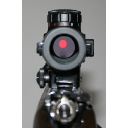 Læg riflen helt fast i sandsæk, skydebænk, ingen panik om første skud sidder - 20 cm fra plettet kl. 2 f.eks. – så fastholder du riflen, sigt på pletten, og drejer tråd korset ud til skud hullet f.eks. først 20 cm op, så ud til skuddet kl. 2. Glem hvor mange klik du skal give den det er blot vigtigt riflen ligger stille og fastholdes.
